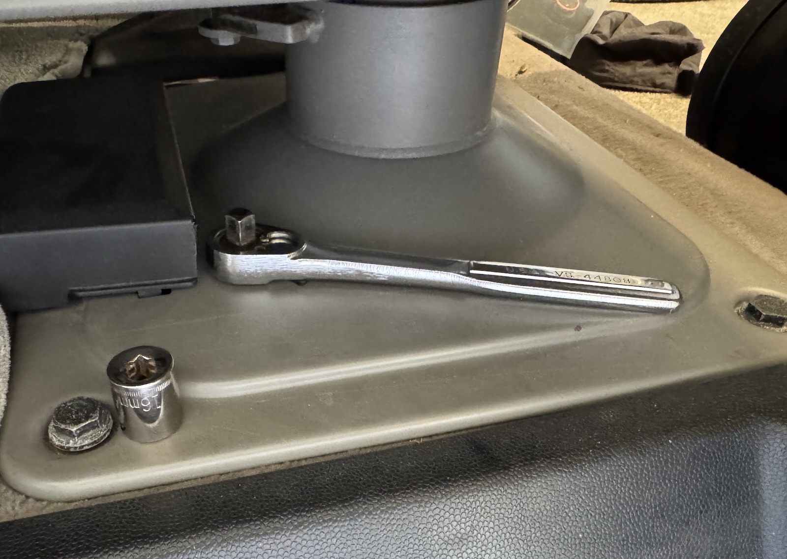 Remove driver side seatbelt (lower bolt, 17mm socket).