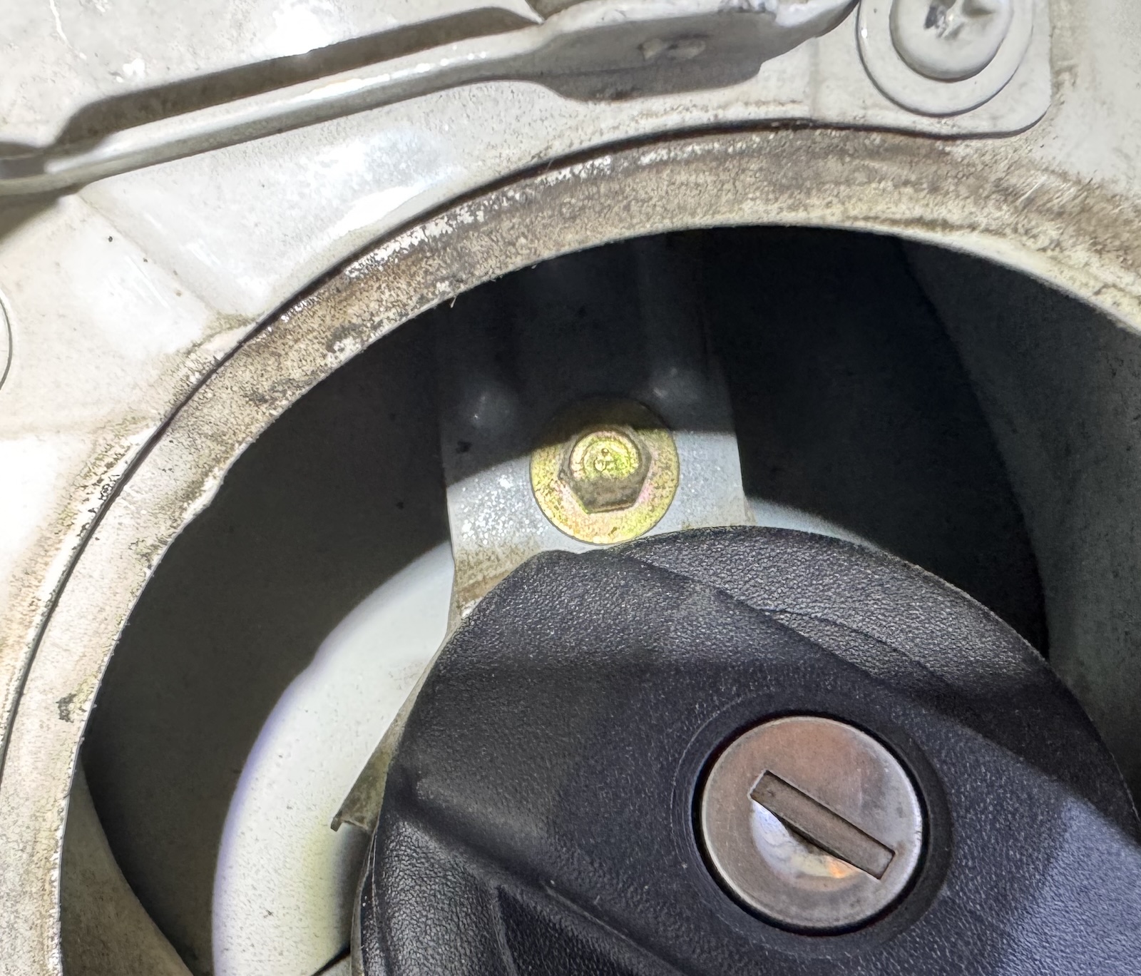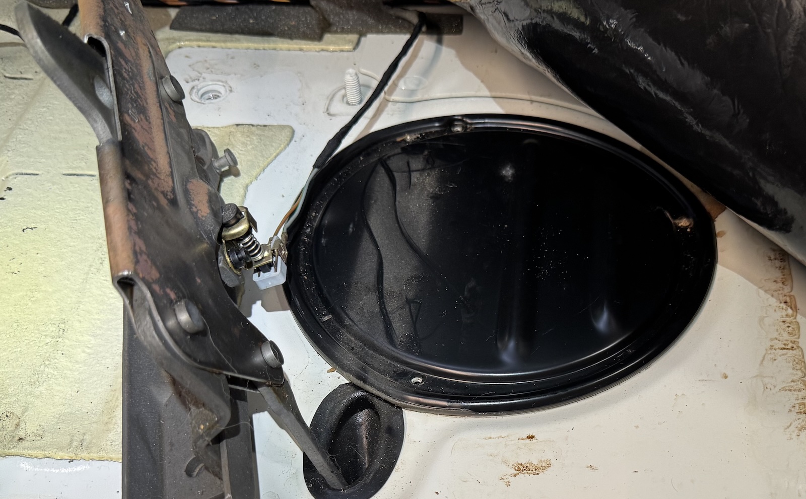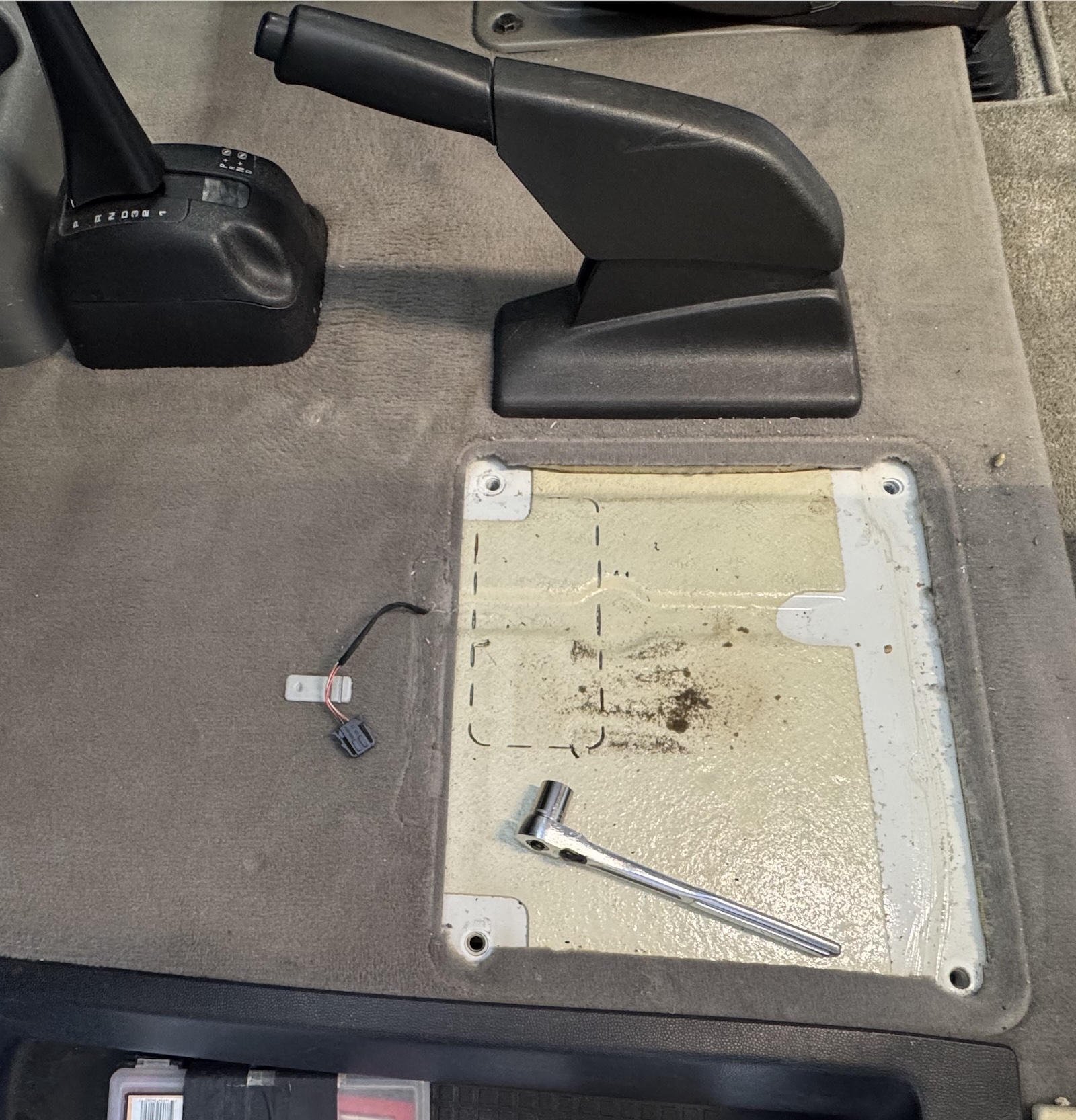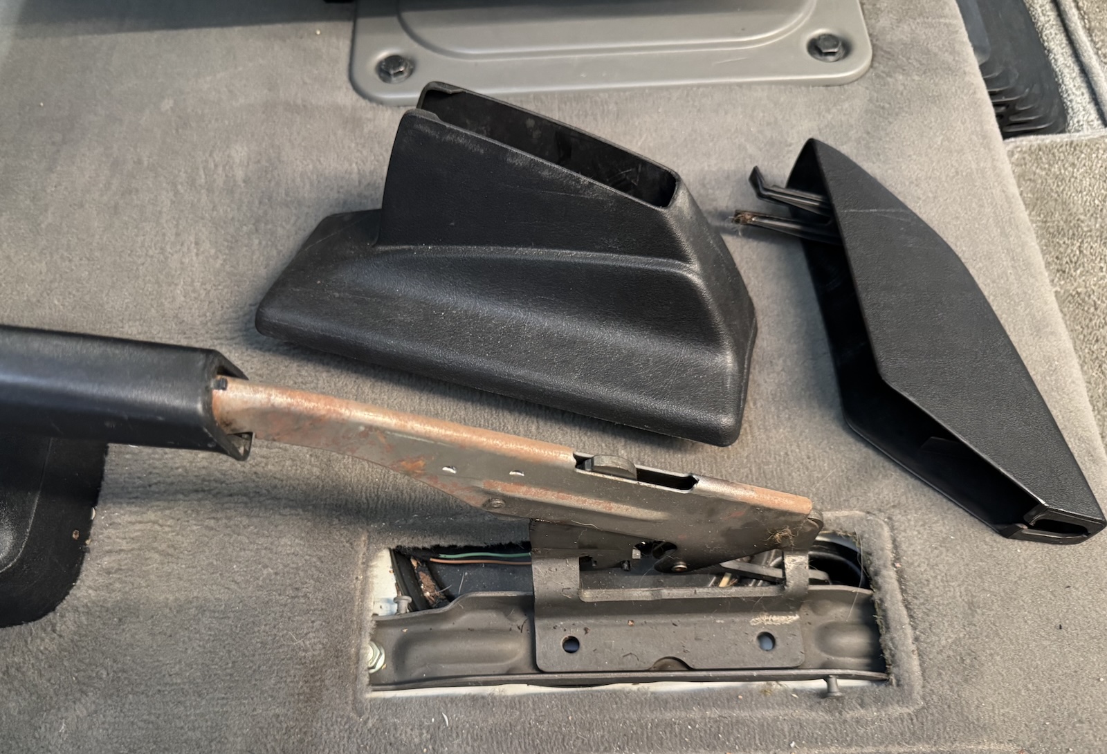 Move the mechanism slightly to the side to give room to access the fuel pump cover. You do not need to disconnect the parking brake linkage. Note: remember to put chocks behind the wheels if the parking brake is off.