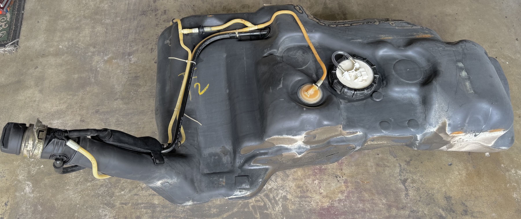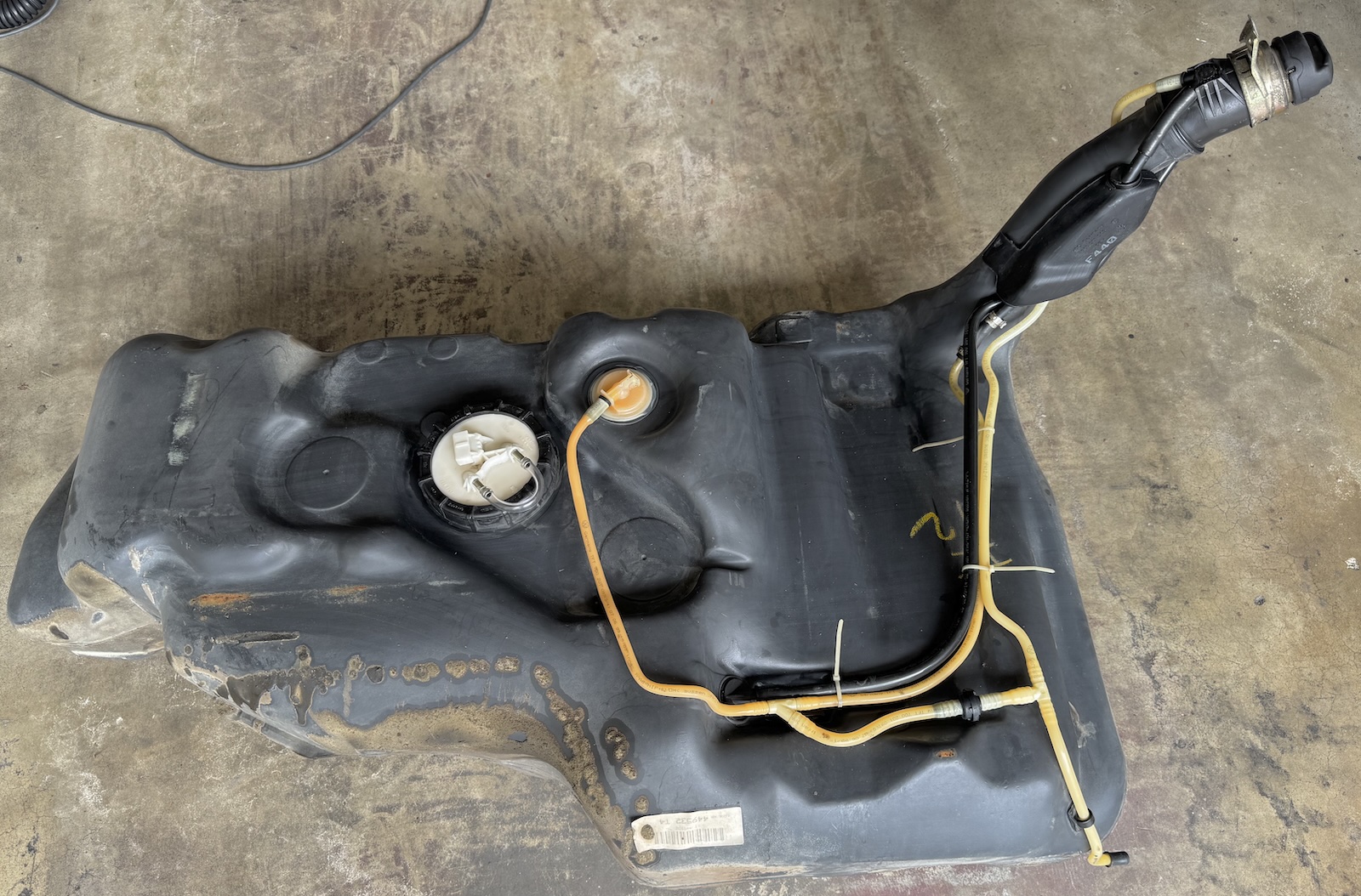 Sliding the fuel tank out from under the van was difficult as I only had the left rail about 15" from the ground. I removed the gas cap which gave me a little more clearance and I was able to wiggle it out. -
