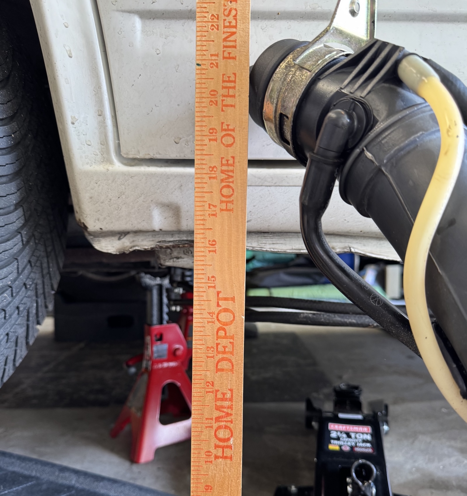 I used ramps which gave the front tires about 6" of lift, which puts the side rail about 15" off the ground. This was barely adequate, as the fuel tank filler neck sits about 23" off the ground. If possible, lift the van so the left side rail is 20" off the ground.